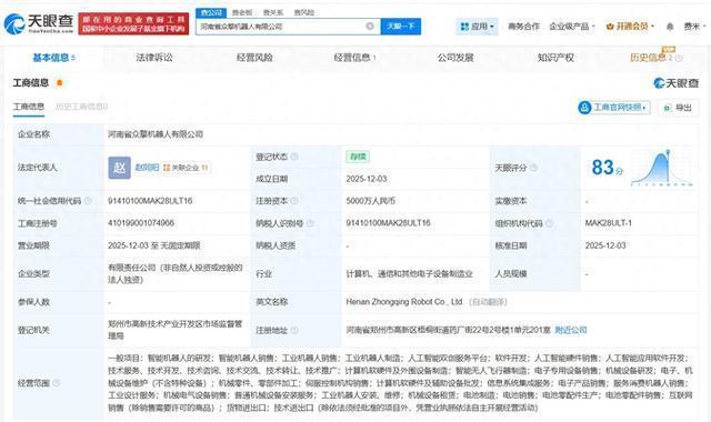 天眼查App显示广东配资公司,近日,河南省众擎机器人有限公司成立广东配资公司,法定代表人为赵同阳,注册资本5000万人民币,经营范围包括智能机器人的研发、智能机器人销售、工业机器人销售、工业机器人制造等,由深圳市众擎机器人科技有限公司全资持股。