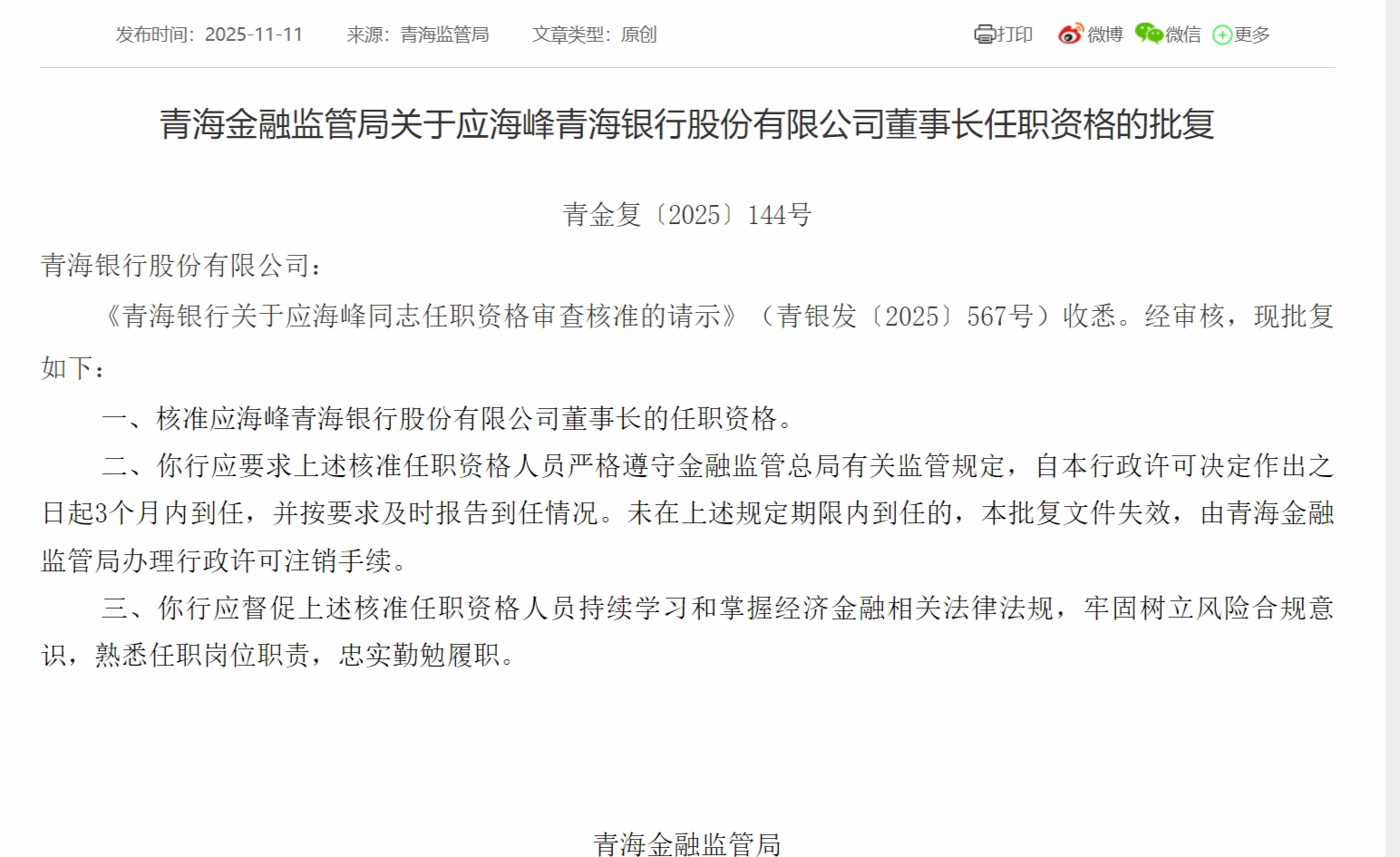 11月11日,青海金融监管局发布关于应海峰青海银行股份有限公司董事长任职资格的批复在线配资平台网址,核准应海峰青海银行股份有限公司董事长的任职资格。