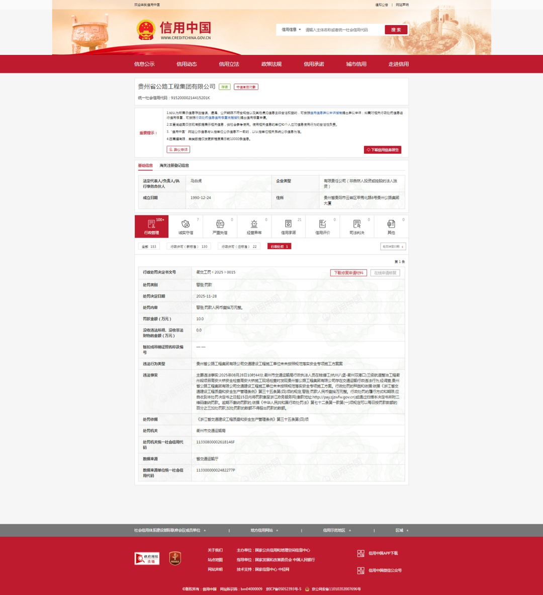 齐鲁晚报·齐鲁壹点记者于信用中国信用行政处罚栏获悉,11月28日,贵州交建集团旗下的贵州省公路工程集团有限公司(下称“贵州公路集团”)收到罚单,其违法行为类型是“交通建设工程施工单位未按照规范落实安全专项施工方案”,处罚类别是“警告;罚款”,处罚机关为衢州市交通运输局。