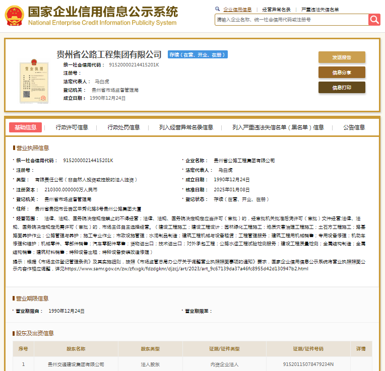 国家企业信用信息公示系统显示,贵州省公路工程集团有限公司成立于1990年配资股票开户,注册资本210300万元人民币,法定代表人马白虎,由贵州交通建设集团有限公司全资持股。